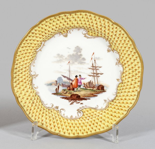 Runde Form mit passig geschweiftem Goldrand. Spiegelfüllende, von mehrpassiger Goldormamentbordüre eingefasste, Hafenszene mit Kaufleuten und Segelbooten. Auf der Fahne zitronengelber Schuppenmosaikfond. Polychrome Malerei mit Goldstaffage. Minim. ber.; Schwertermarke. D. 21 cm.