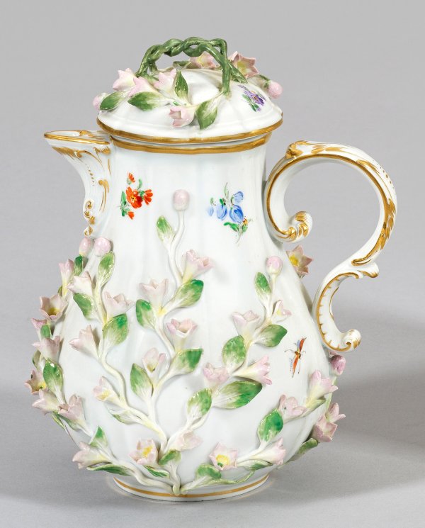 Birnform mit kannelierter Wandung, Rocaillehenkel und passig aufgewölbter Deckel mit geflochtenem Stengelknauf. Allseits auf der Wandung reicher, reliefplastischer Blütendekor aus Jasminzweigen. Streublümchen und Insekten. Polychrome Malerei mit Goldstaffage. Unw. rest.; Minim. best.; Schwertermarke. H. 17 cm.