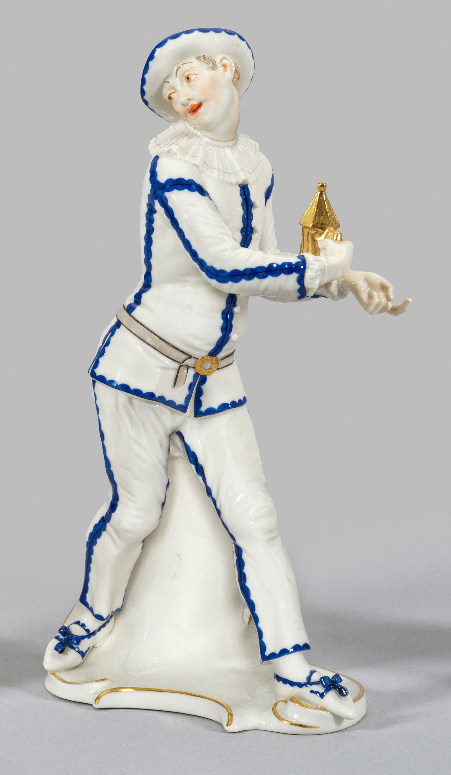 Auf Rocaillesockel mit Stützvolute schreitender, zurück gewandter Pierrot im Harlekinskostüm, in der rechten Hand eine Laterne haltend. Polychrome Malerei mit reicher Goldstaffage. Entw. Franz Anton Bustelli, 1759/1760. Manufakturmarke. H. 21 cm.