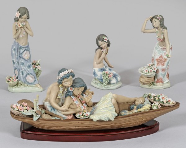 4-tlg.; Auf plastisch ausgearbeiteten Felssockeln stehend bzw. hockend drei junge Frauen, umgeben von exotischen, fein naturalistisch ausgearbeiteten Blumenarrangements, bekleidet mit langen, traditionell gemusterten Röcken und Blumenschmuck. In einem Kanu sitzend bzw. liegend ein junges Paar, umgeben von diversen Blumen und Früchten eine Blumenschale betrachtend. Partiell minim. best.; Teilw. besch.; Manufakturmarke, eingepresste Limitierungsnummern. H. 15 cm - 24 cm. Boot-L. 20 cm x 16 cm.