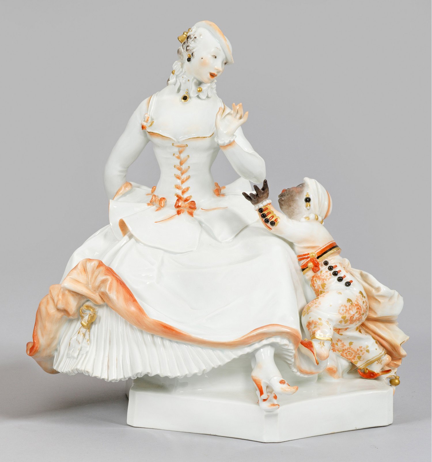 Auf sechseckigem Sockel sitzende Rokoko-Dame. Seitlich kniender Mohr, den von der Dame versteckten Ball einfordernd. Sparsame, teilw. goldgehöhte, polychrome Aufglasurmalerei. Entw. Paul Scheurich, 1919. Modell-Nr. F 274. Entw.-Bez. mit Dat.; Schwertermarke. Partiell best.; H. 28,5 cm.