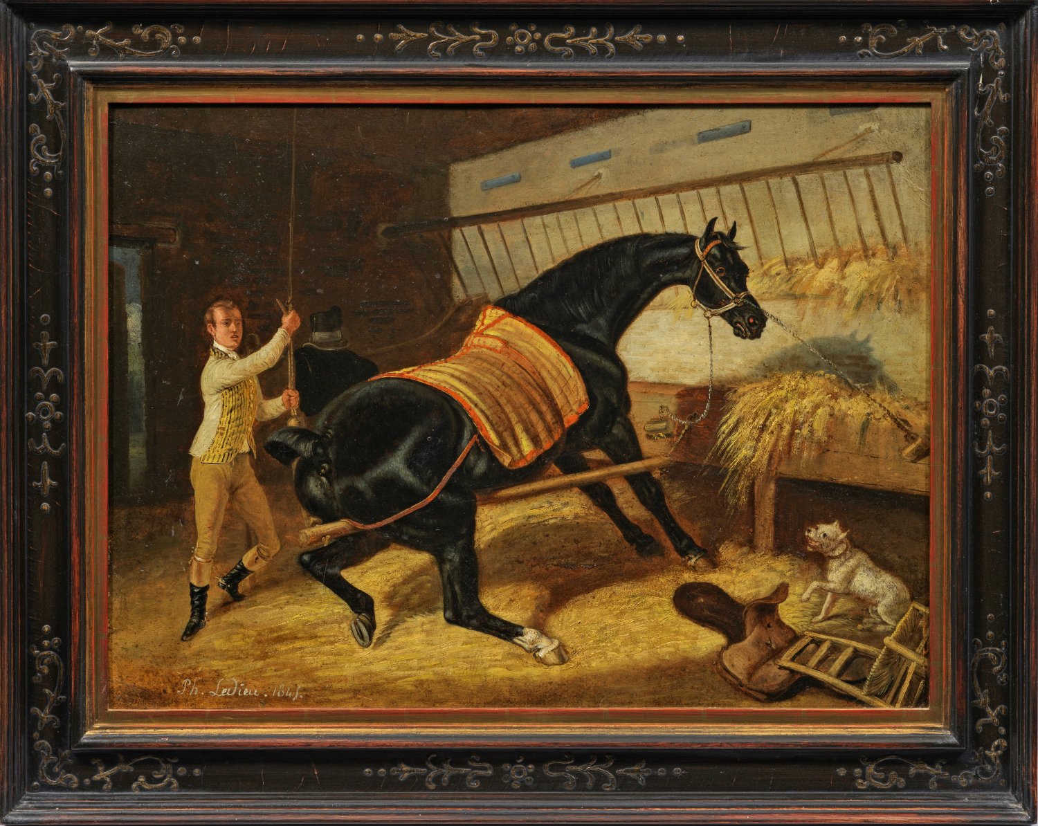 In effektvoller Lichtbehandlung und lebendiger Stofflichkeit geschilderte, erzählerisch angelegte Stallszene des französischen Malers und Illustrators, der Schüler von Horace Vernet war und mit Vorliebe Tierstücke und Jagdszenen schuf. 1824 entdeckte Ledieu zusammen mit seinem Malerkollegen und Freund Claude Aligny den Ort Barbizon im Wald von Fontainebleau, dessen Umgebung eine besondere Wirkung auf die Maler besaß und wenig später zur Geburtsstätte der dortigen bedeutenden Künstlerkolonie wurde. Öl/Platte. L. u. sign. u. dat. 1845(?). 46,5 cm x 63,2 cm (Sichtmaß). Rahmen.