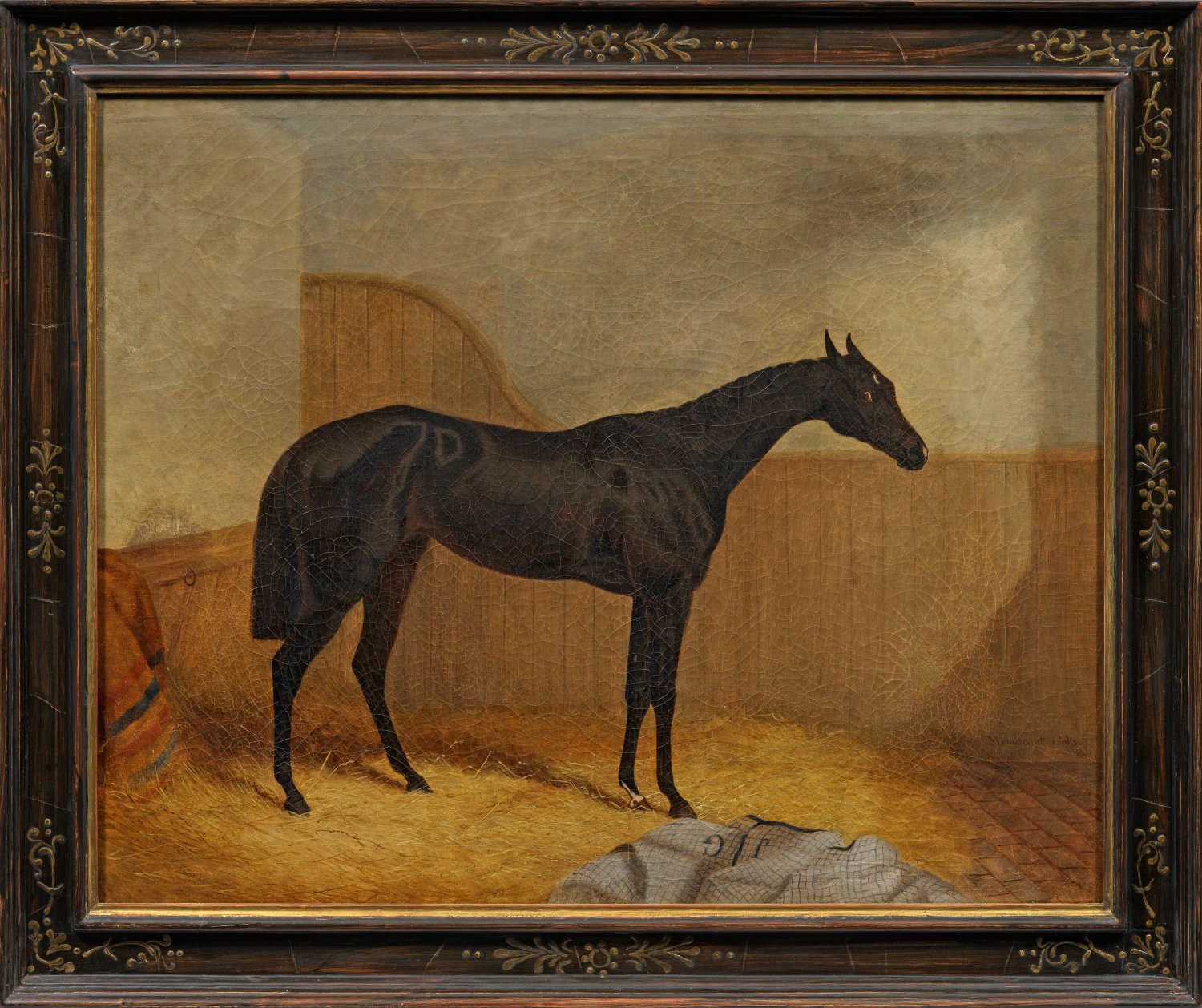 Charakteristische Pferdedarstellung Halls, der sich nach seiner Ausbildung bei Abraham Cooper auf die Wiedergabe von Pferden spezialisierte und sich rasch zu einem der gefragtesten Tierporträtisten seiner Zeit entwickelte. Das erfolgreiche Rennpferd Mendicant, das u. a. 1846 das Oak Stakes Rennen in Epsom gewann, wurde von Hall mehrfach porträtiert, u.a. publiziert als Stich von Charles Hunt. Öl/Lwd., doubliert. R. seitl. bez. und dat. "Mendicant. Oaks. (/) 1846". Verso 61,5 cm x 77 cm. Rahmen.