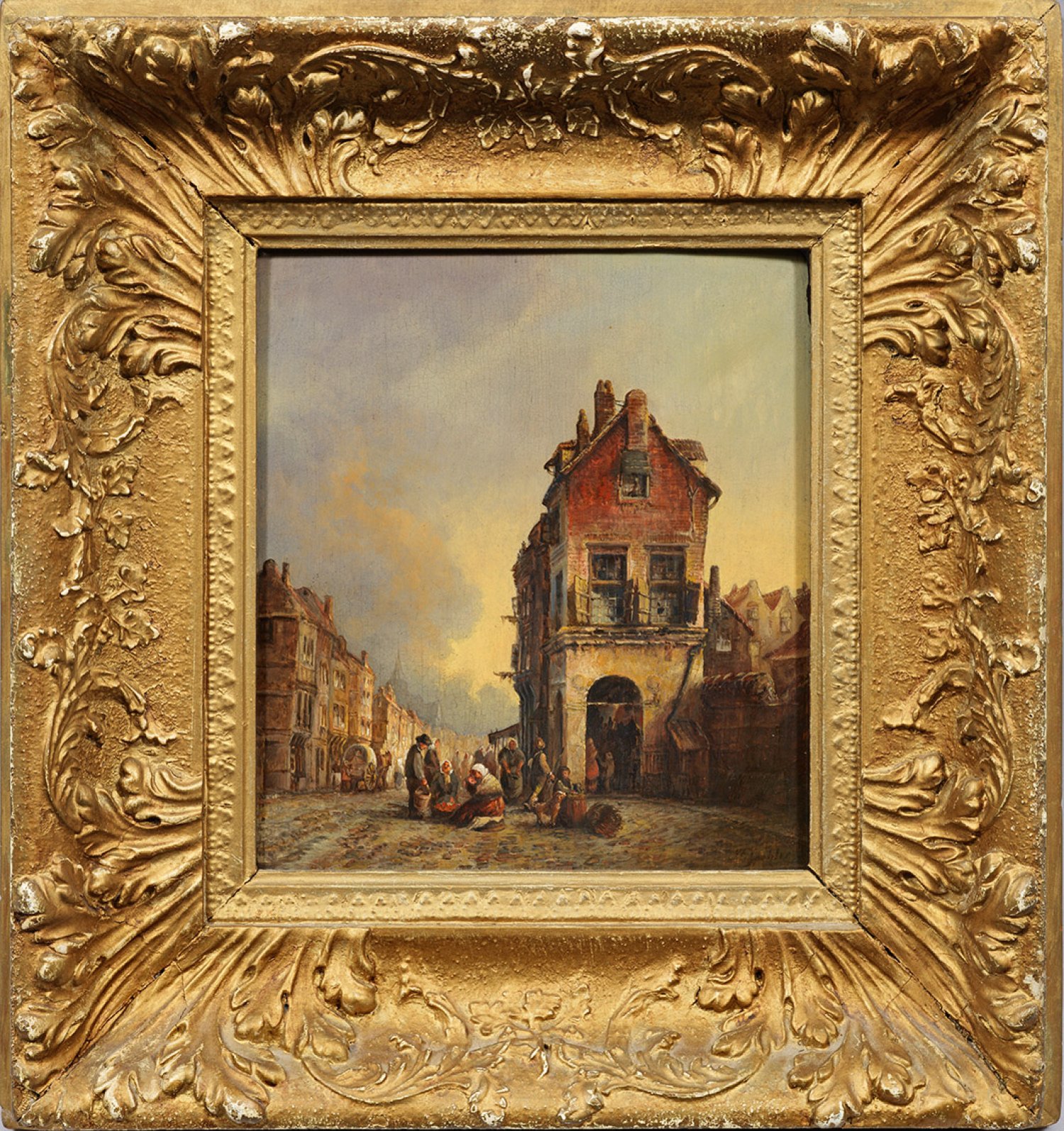 Fein gemaltes Werk Spohlers, der sich - anders als sein Vater Jan Jacob Spohler und sein Bruder Jan Jacob Coenraad Spohler - auf die Schilderung altholländischer Stadt- und Dorfansichten anstatt auf Landschaften und Eisansichten verlegte. Stark beeinflusst durch das Oeuvre Cornelis Springers, werden seine Gassen und Grachten belebt von reger Personenstaffage und durch fein nuancierte Lichtbehandlung effektvoll inszeniert. Öl/Eichenholztafel. R. u. sign.; 23,5 cm x 23 cm. Rahmen.