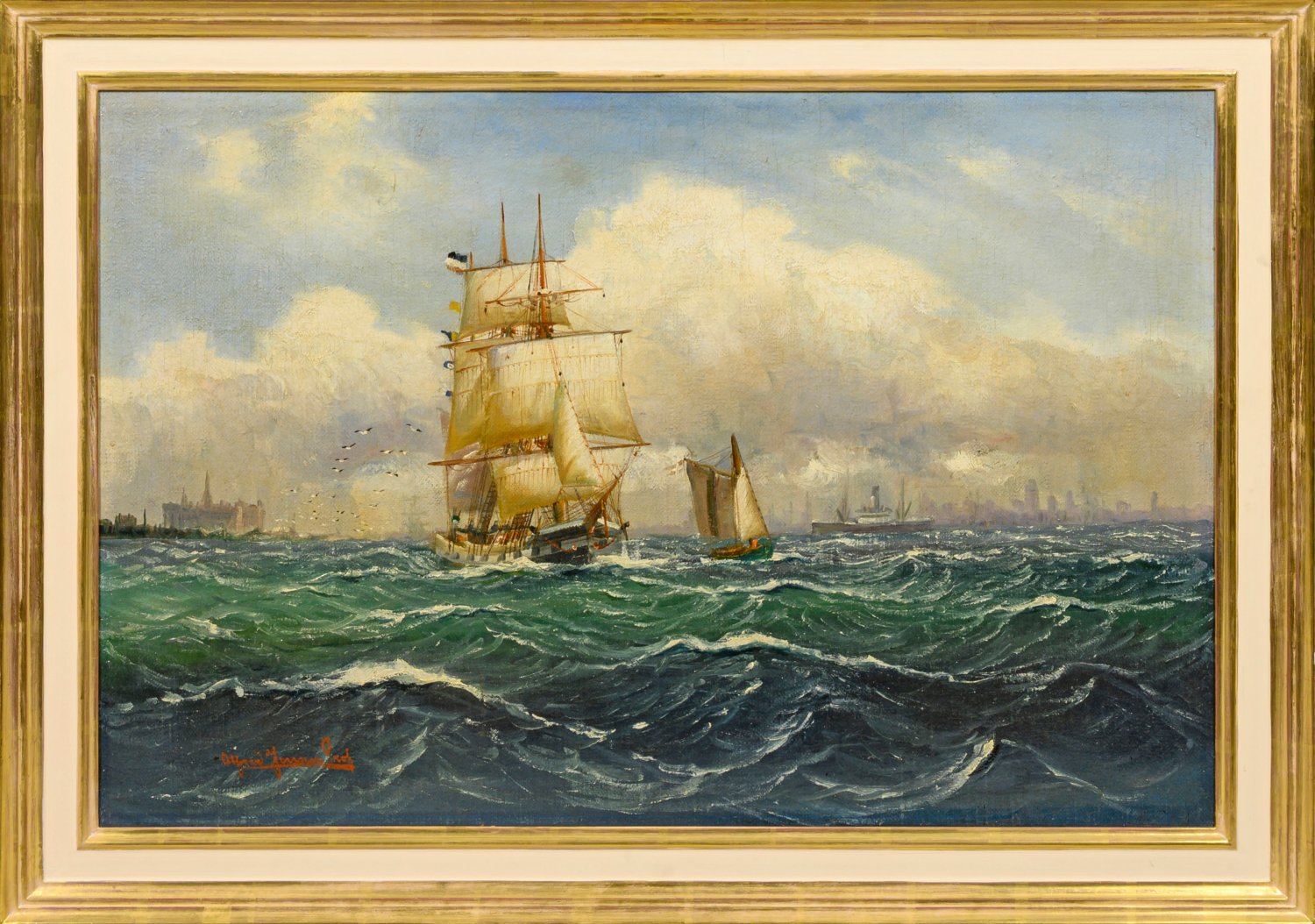 Charakteristisches, nach 1900 entstandenes Werk des deutsch-dänischen Marinemalers, der selbst zur See fuhr. Seine künstlerische Ausbildung erhielt er bei Heinrich Leitner in Hamburg sowie an der Akademie in Kassel bei Emil Neumann, bevor er ab 1900 als Professor an der Kunstgewerbeschule in Hamburg tätig war. Öl/Lwd.; L. u. in Rot sign.; 54,5 cm x 80,5 cm. Rahmen.