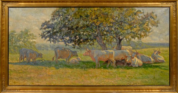 Großformatige, Tier- und Landschaftsmalerei verbindendes Werk in hell leuchtendem, nuanciertem, pastelltonigem Kolorit, das die sommerlich warme Stimmung und hellen Lichtflecken auf den Kühen, die Schutz unter den Bäumen suchen, einfängt. Öl/Lwd.; 97 cm x 195 cm. Rahmen.