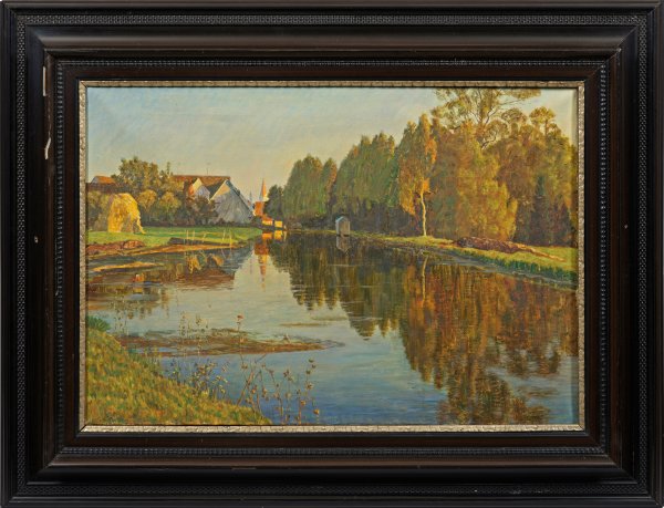 Impressionistische, sommerlich-heitere Abendstimmung. Kauzmann, der sich erst ca. 1907 der Malerei zuwandte, studierte an der Kunstakademie in Stuttgart und nahm privaten Unterricht bei Künstlern wie Hermann Groeber und dem Freilichtmaler Bernhard Buttersack in München. Kauzmann spezialisierte sich auf Landschaften und Interieurs, stellte im Münchener Glaspalast aus. Öl/Lwd.; L. u. sign. u. dat. 1920(?). 53 cm x 76 cm. Rahmen.