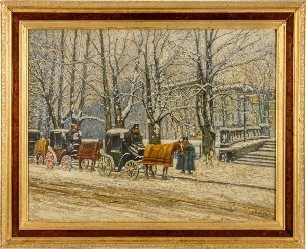 Frühes, impressionistisches Werk des Künstlers mit wartenden Kutschen in einer Parklandschaft mit großem Gebäudekomplex. Pallmann schilderte in Gemälden und Grafiken neben Berlin verschiedenste Städte, darunter Hamburg, Stockholm, Stralsund, Dessau und Zerbst. Öl/Lwd., doubl.; R. u. sign. u. dat. (19)07. 74 cm x 94,5 cm. Rahmen.
