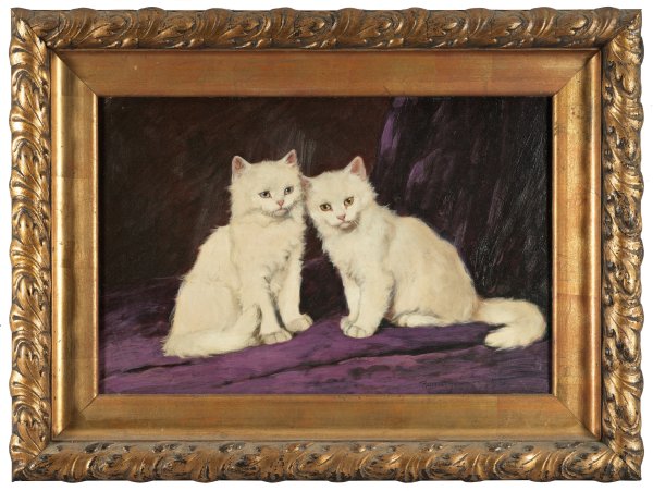 Subtil und einfühlsam charakterisiertes Tierstück der ungarischen Malerin, die an der Akademie in Budapest bei Tivadar Zemplényi, Antal Neogrady und László Hegedüs studierte. Öl/Lwd.; R. u. sign.; 40 cm x 60 cm. Rahmen.