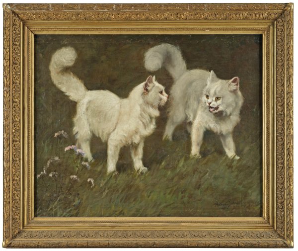 Charakteristisches, impressionistisches Werk der an der Budapester Akademie ausgebildeten Künstlerin, die sich auf die subtil beobachtete Darstellung von Katzen, insbesondere weißen Angorakatzen, spezialisierte. Öl/Lwd.; Zweifach sign.; 60 cm x 80,5 cm. Rahmen.