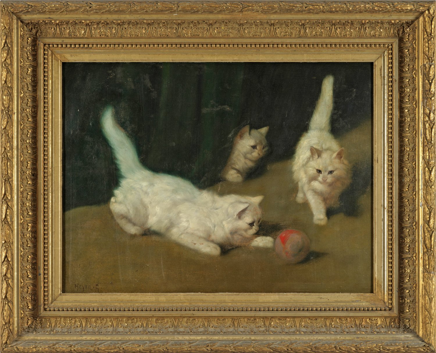 Sehr lebendig und einfühlsam geschilderte, charakteristische Katzendarstellung Heyers, der 1896 nach Budapest ging und dort erfolgreich sowohl nationale als auch internationale Ausstellungen mit seinen Katzenbildern beschickte. Öl/Lwd., kaschiert auf Karton. L. u. sign.; Ca. 50 cm x 67 cm. Rahmen.
