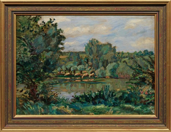 Impressionistische, während des I. Weltkrieges 1917 in Nordfrankreich entstandene Landschaft des Malers, der an der Akademie in Karlsruhe bei Wilhelm Trübner und Hans Thoma studierte. Öl/Lwd.; L, u. sign., bez. u. dat. (in Versalien) "Alfr. Schnaars (/) Im Felde (/) 1917. A. d. Aisne". Verso betitelt. 50 cm x 70 cm. Rahmen.