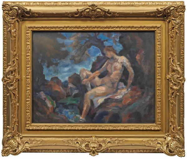 Mit breitem, flächigem Farbauftrag gemalte, expressiv realistische, moderne Darstellung eines sitzenden, weiblichen Aktes an einem Quell. Öl/Lwd.; L. u. sign. "Pistorius", verso auf dem Keilrahmen sign. u. betitelt. 45 cm x 60 cm. Rahmen.