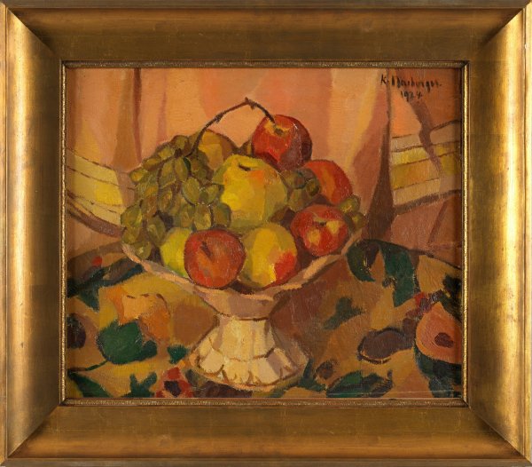 Charakteristisches, expressionistisch konzipiertes Stillleben der Stuttgarter Künstlerin, die bei Adolf Hölzel und Gustav Igler an der Akademie in Stuttgart ausgebildet wurde und Mitglied der dortigen Sezession war. Aufgrund ihrer jüdischen Herkunft emigrierte die Künstlerin, die heute zur sog. "Verschollenen Generation" zählt, 1941 in die USA. Als sich 1947 die Stuttgarter Sezession neu begründete, wurden Werke von getöteten und emigrierten ehemaligen Mitgliedern gezeigt, so auch ein "Früchte-Stillleben" von Klara Neuburger. Öl/Lwd.; R. o. sign. und dat. 1924. 46,5 cm x 54 cm. Rahmen.
