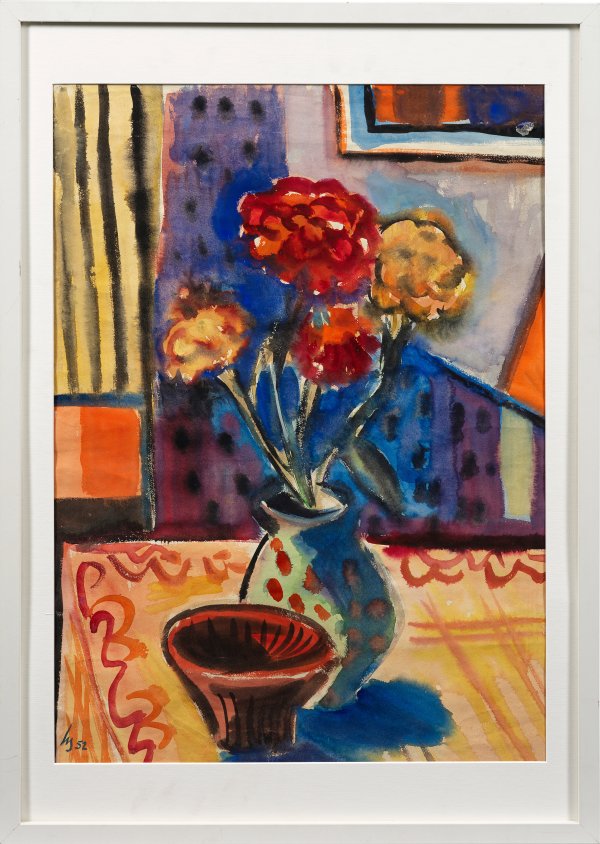 Expressionistisches Werk aus dem reifen Oeuvre Schmuckers, der als Künstler zur sog. Verschollenen Generation gehört. Schmucker studierte an der Münchener Akademie bei Franz von Stuck, 1932 ließ er sich in Berlin nieder, 1934 in Königsberg. 1947 wagte Schmucker in München einen Neubeginn und fand auch zur Abstraktion, stellte alljährlich im Haus der Kunst aus. Aquarell/Papier. L. u. monogr. u. dat. (19)52. 58,5 cm x 43 cm (Passepartoutausschnitt). Rahmen ohne Glas. Watercolour on paper. Monogrammed and dated (19)52.