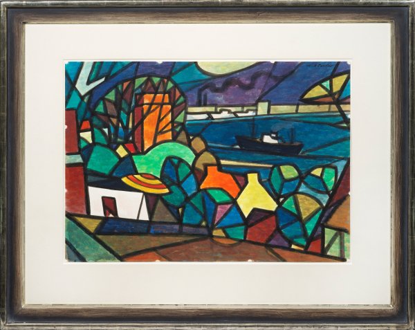 Aus stark konturierten, leuchtenden Farbflächen komponierte Arbeit Rösslers, der in Gablonz, Dresden und München ausgebildet wurde und sich nach dem Zweiten Weltkrieg in Hamburg niederließ. Aquarell/Bütten. R. o. sign.; 52,8 cm x 76,3 cm. Rahmen.