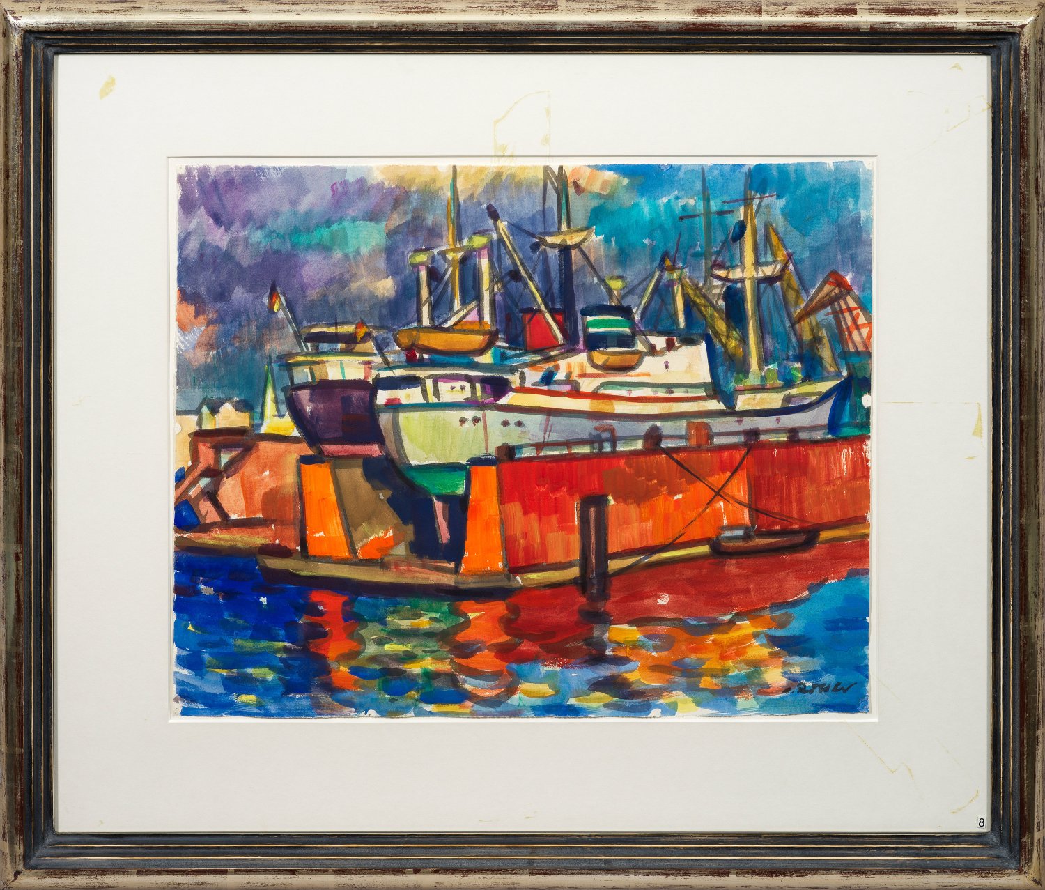 Mit breiten Pinselstrichen und in leuchtendem Kolorit angelegte Hafenimpression Rösslers, der in Gablonz, Dresden und München ausgebildet wurde und sich später in Hamburg niederließ, wo er fortan eine Vielzahl seiner Motive fand. Aquarell/Bütten. R. u. sign.; 49 cm x 62 cm. Rahmen.