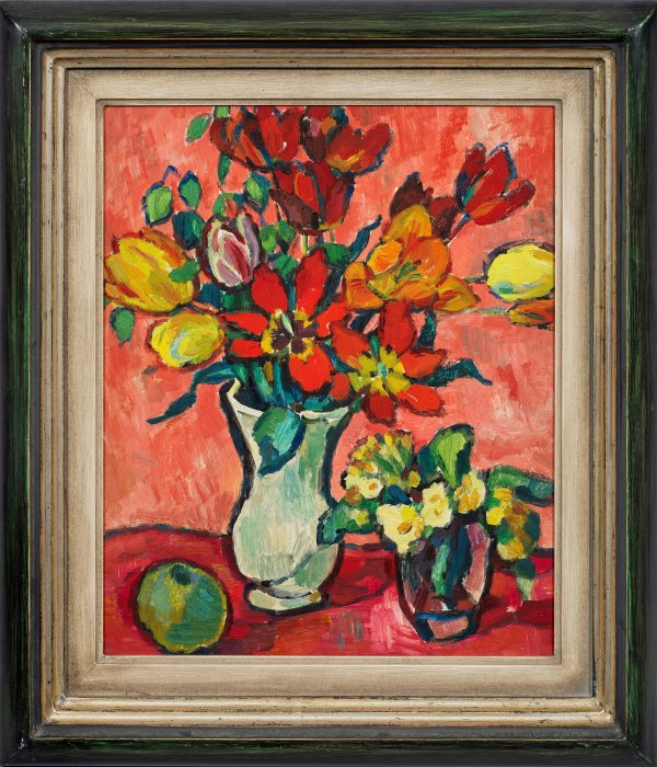 Mit expressivem Pinselstrich und kräftiger Konturlinie gemaltes Stillleben mit Tulpen, Schlüsselblumen und einem grünen Apfel. Alfred Rössler absolvierte seine Ausbildung an der Gablonzer Kunstakademie und bildete sich anschließend in Dresden und München weiter. Nach dem Zweiten Weltkrieg, in dem sein frühes Werk bei einem Bombenangriff auf Dresden verloren ging, ließ er sich in Hamburg nieder. Öl/Masonit. Verso dat. 18.V.(19)56. 41,5 cm x 35 cm. Rahmen.