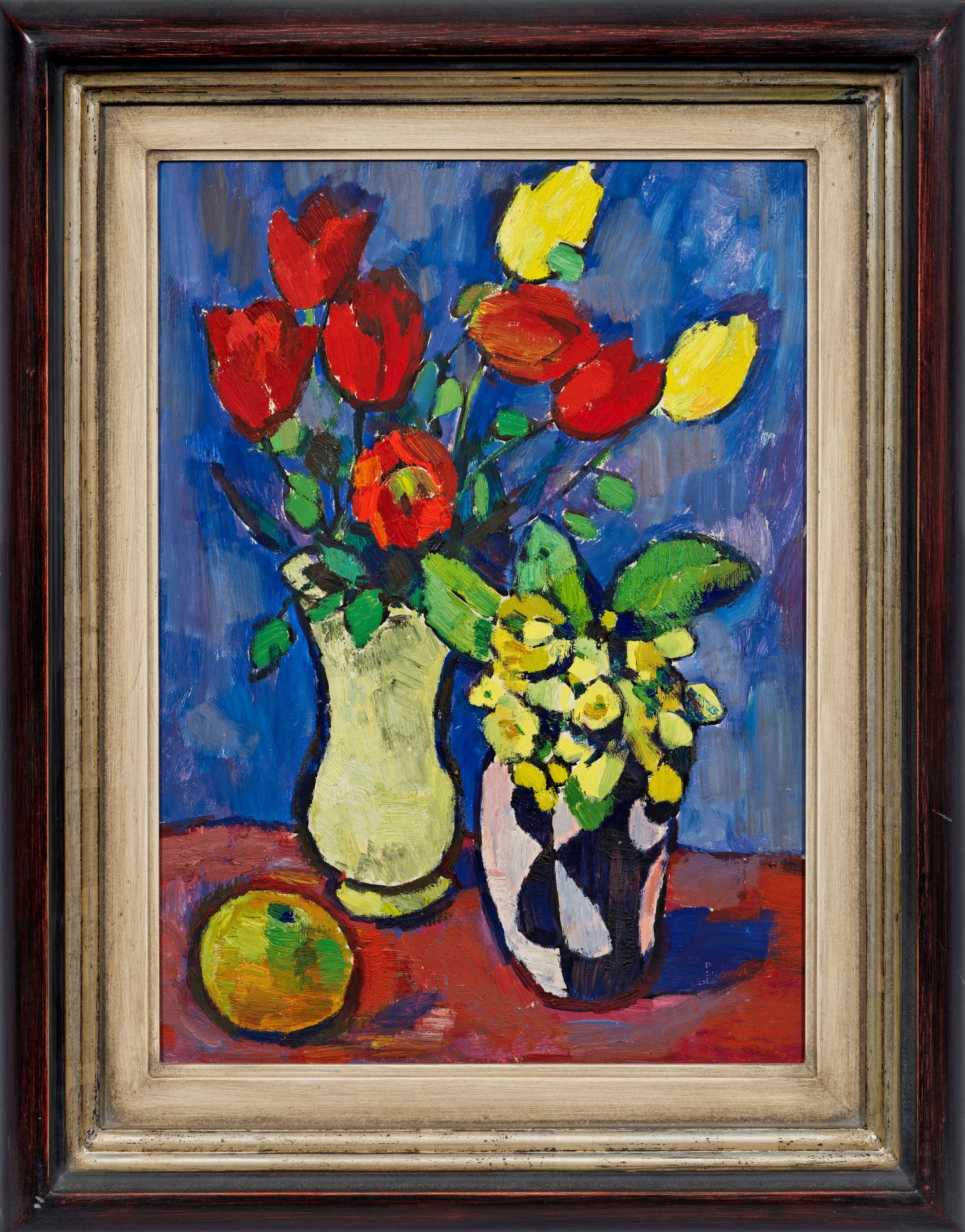 Expressive, kräftig kolorierte Arbeit Rösslers, der zunächst die Akademie in Gablonz besuchte und anschließend seine Studien in Dresden und München fortsetzte. Das Frühwerk des in Hamburg ansässigen Künstlers wurde bei einem Bombenangriff in Dresden fast vollständig zerstört. Öl/Masonit. Verso dat. 16.V.(19)52. 44,5 cm x 32,5 cm. Rahmen.