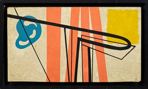 Aus Linien, amorphen Formen und Farbflächen komponierte Arbeit in der Tradition deutscher, abstrakter Künstler der Nachkriegszeit wie Walter L. Brendel und Otto Ritschl. Mischtechnik mit Öl/Platte. R. u. monogr. und undeutl. dat. (19)52(?). Verso Collage/Mischtechnik, diese bez. "Mit rosa Streif... (/) Kat. Nr. 29". 31 cm x 55 cm. Rahmen.