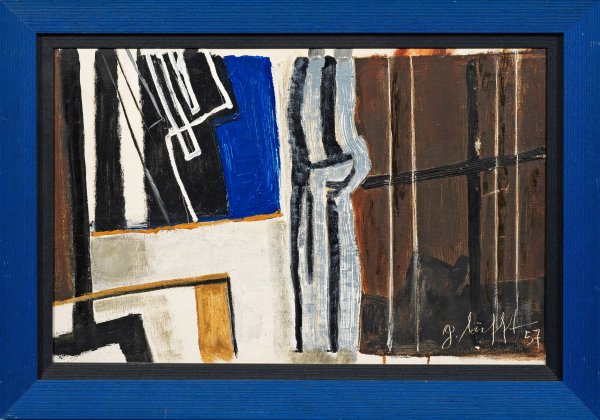 Abstrahierte, von vertikalen Linien dominierte Arbeit Luffts, der nicht nur als Maler und Fotograf tätig war, sondern auch zahlreiche Kunstkritiken und -publikationen - nicht zuletzt in seiner Position als Geschäftsführer des Braunschweiger Kunstvereins - verfasste. Öl/Lwd., kaschiert auf Karton. R. u. sign. u. dat. (19)57. Verso nochmals sign. und dat. sowie betitelt. Ca. 38 cm x 59 cm. Rahmen.