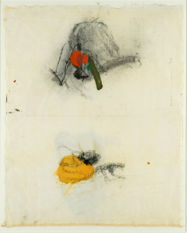 Assoziative, in Form und Kolorit reduzierte Komposition Krawagnas, der 1953-1957 zunächst an der Kunstschule in Linz, danach bis 1961 an der Akademie in Wien und 1963/64 an der École des Beaux-Arts in Paris studierte. Mischtechnik/Japan. Sign. und dat. (19)94. Blatt 50 cm x 63,5 cm. Rahmen.