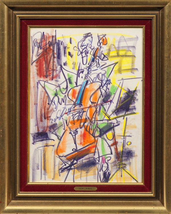 Äußerst dynamisch und furios angelegte Komposition, die durch ihre expressive Linienführung und heitere, leuchtende Farbigkeit starke Lebensfreude vermittelt. Paul wuchs in Montmartre auf und kam schon früh mit der dortigen Kunstszene in Berührung, die ihn nachhaltig prägte. Kohle, Kreide und Pastel/Papier. L. ob. sign.; Sichtmaß 31 cm x 41,6 cm. Rahmen.