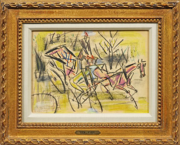 Expressive, auf Linien fokussierte Arbeit Pauls, in der er Dynamik und Lebensfreude vortrefflich einfängt. Der in Montmartre geborene Künstler verkehrte in der Pariser Kunstszene und bildete sich unter deren Einfluss autodidaktisch fort. Schwarze u. Farbkreide/Papier. L. u. sign. u. dat. (19)57. Verso bez.; Sichtmaß ca. 20,5 cm x 29 cm. Rahmen.