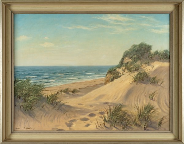 Unter heiterem, spärlich bewölktem Himmel, atmosphärisch eingefangene Ostseeimpression mit Blick aus den hügeligen Dünen, frischen Spuren im Sand und von der Meeresbrise bewegten Grashalmen. Öl/Lwd.; L. u. sign.; Verso bez. und betitelt. 60,5 cm x 80,5 cm. Rahmen.