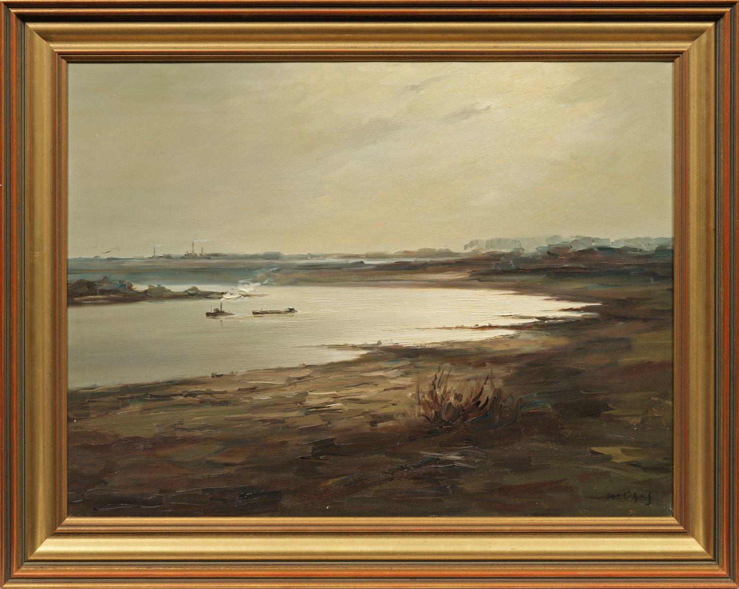Blick auf eine breite Rheinschleife mit Schlepper und Lastkahn. Der an der Kunstgewerbeschule in Stettin und Hochschule für Bildende Künste in Berlin ausgebildete Künstler wurde vor allem als Tier- und Jagdmaler bekannt, der seine Motive in Stimmungslandschaften komponierte. Daneben schuf er eine kleinere Anzahl reiner Landschaften wie diese. Öl/Lwd.; R. u. sign.; 60 cm x 80 cm. Rahmen.
