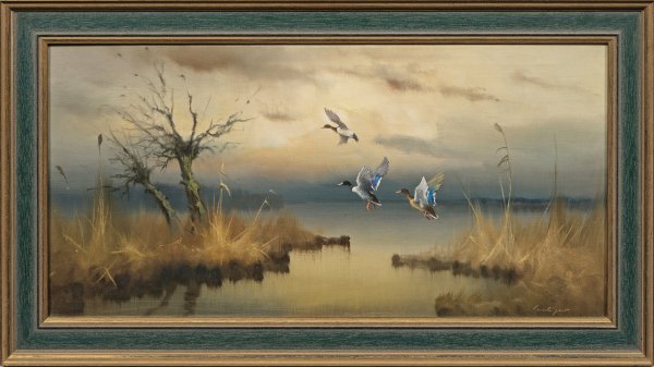 Stimmungsvolles, motiv- und stiltypisches Werk des Künstlers, der sich nach seinem Studium in Düsseldorf, München und Paris auf die Jagd-, Tier- und Landschaftsmalerei spezialisierte. Zur Differenzierung von seinem populären Bruder Manfred Schatz, der durchaus vergleichbare Tier- und Jagdbilder schuf, verwendete er das Pseudonym "Seeliger". Öl/Lwd.; R. u. sign. unter seinem Pseudonym "Seeliger". 40 cm x 80 cm. Rahmen.