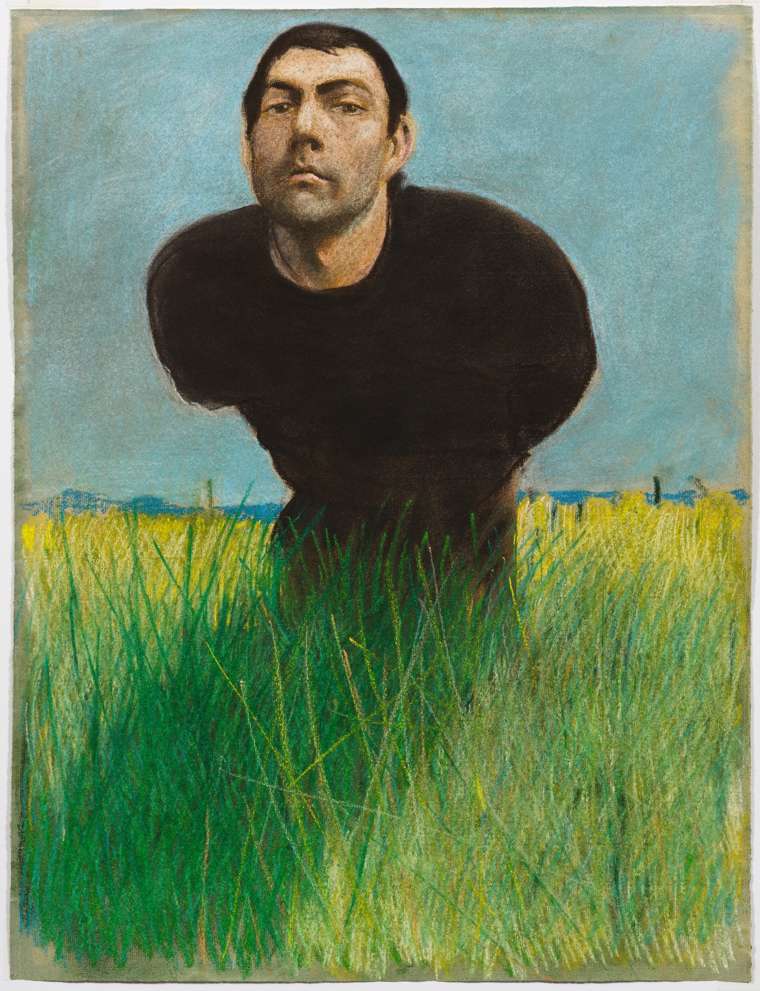 Wie häufig in seinen Werken arbeitet Grützke auch hier mit optischen Verzerrungseffekten, indem er seinen Kopf dem Betrachter entgegenstreckt. Grützke war 1973 Mitbegründer und seitdem bekanntester Maler der "Schule der neuen Prächtigkeit", er arbeitete in einem expressiv figurativen, sehr eigenständigen Stil mit kritisch übersteigertem Blick: ironisch überzeichnete Szenen und Figuren, schonungslos entidealisierte Porträts mit bis zum Grotesken gesteigerter Verzerrung der Charakteristik und Physiognomie. Pastell/Papier. R. o. monogr. u. dat. (19)77. 62,8 cm x 48 cm. Im Passepartout.