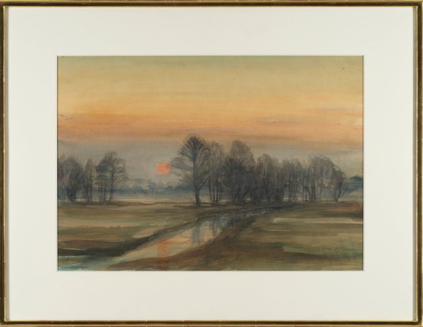 Stimmungsvolle, charakteristische Landschaftsimpression des aus der bedeutenden Künstlerfamilie in Worpswede und Fischerhude stammenden Malers, der 1934-1939 an der Nordischen Kunsthochschule in Bremen und der Akademie in München bei Karl Caspar und Adolf Schinnerer studierte. Aquarell/Papier. L. u. monogr. und dat. (19)59. 43 cm x 61,5 cm (Passepartoutausschnitt). Rahmen.