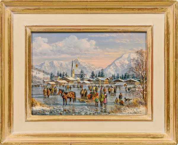 Ausgelassene, heitere Schilderung vor der Kulisse eines oberbayerischen Dorfs mit verschneitem Alpenpanorama. Charakteristisches Werk des an der Münchener Akademie ausgebildeten Tier- und Landschaftsmalers, der stilistisch nahtlos an die ältere Münchener Schule anknüpft. Öl/Holztafel. R. u. sign.; Verso nochmals über Papieretikett mit Werk-Nr. D5252206D9 sign.; 18 cm x 24 cm. Rahmen.