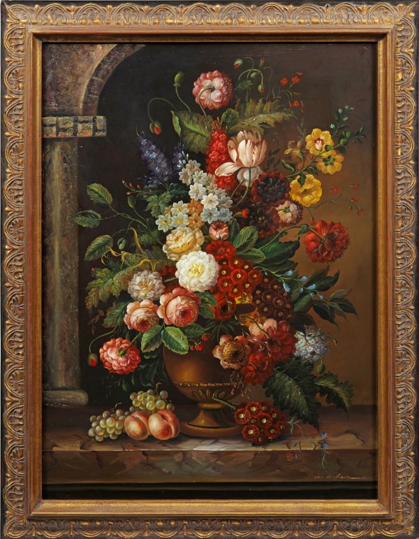 Unter einer steinernen Bogenarkade arrangierter, opulenter Frühlings- und Sommerblumenstrauß in der Tradition niederländischer und flämischer Stilllebenmaler und -malerinnen des 17./18. Jhs. wie Jan van Huysum, Gaspar Peeter Verbruggen d. J., Rachel Ruysch etc.; Öl/Lwd.; 120 cm x 90 cm. Rahmen.