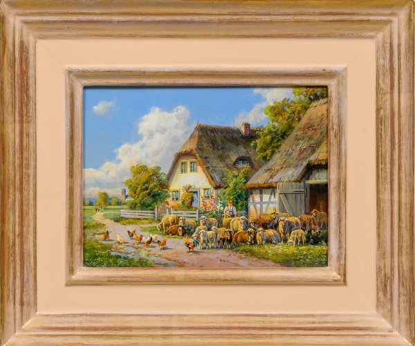 Vor einem pittoresken Gehöft sammelt der Schäfer seine Schafe um sich, die von Hühnern und Hahn begleitet werden. Sommerlich heiter gestimmte Impression Kaplans, der an der Münchener Akademie ausgebildet wurde. Sein malerischer Stil, der sich durch subtile Naturbeobachtung, äußerst lebendige Wiedergabe, effektvolle Lichtführung und virtuoses Kolorit auszeichnet, knüpft hierin nahtlos an die ältere Münchener Schule an. Öl/Holztafel. L. u. sign.; Verso nochmals über Papieretikett mit Werk-Nr. A2988595S3 sign.; 15 cm x 20 cm. Rahmen.