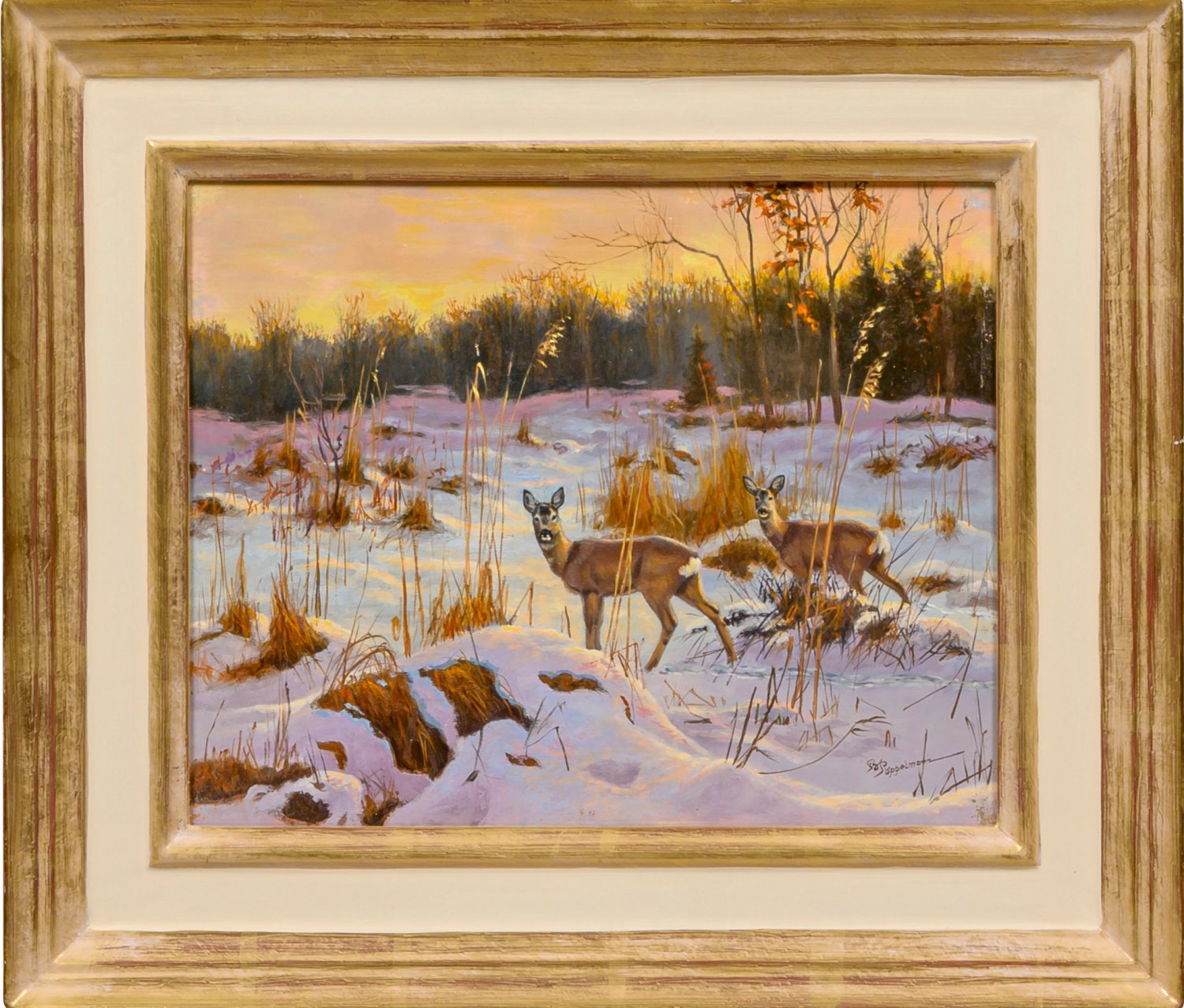 Stimmungsvolles, repräsentatives Werk des bekannten Tiermalers, der sich vor allem auf die naturalistische Darstellung von Tieren in ihren angestammten Umgebungen - der "Wildlife-Art" spezialisiert hat. Außer durch Ausstellungen in Deutschland, in den Niederlanden, in Belgien, in den USA und in Japan wurde er durch zahlreiche Illustrationen bekannt. Öl/Holzplatte. R. u. sign.; Verso Ausstellungsetikett. 23,3 cm x 29,5 cm. Rahmen.