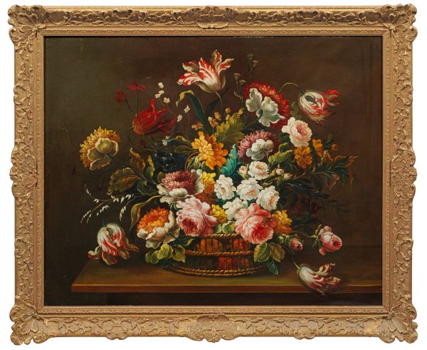 Auf einer Tischplatte platzierter, durchbrochen geflochtener Korb mit einem opulenten Bukett aus unterschiedlichen Frühlings- und Sommerblumen, deren Blüten vor einem dunklerem, tonig ausgeführten Hintergrund umso prachtvoller und farbiger leuchten. Das große Stillleben steht in Komposition, Motiv und Stil in der Tradition von Jan Brueghel d. Ä. und Jan Brueghel dem Jüngeren, die eine Reihe vergleichbarer Blumenkorbschilder schufen. Öl/Lwd.; 80,5 cm x 102 cm. Rahmen.