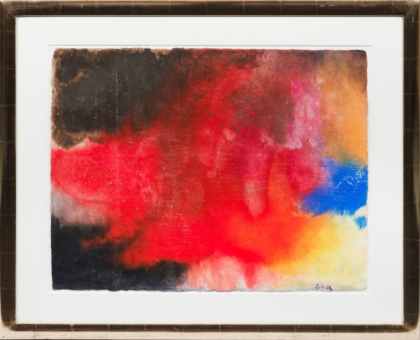 Frühe, noch mit "Biro" signierte Arbeit des ungarisch-französischen Malers, geprägt von der informellen Abstraktion. Biró absolvierte ein Architekturstudium in Paris und Stuttgart, zugleich erhielt er Malunterricht bei Willi Baumeister. Befreundet mit Georg Karl Pfahler war Biró 1956 Mitbegründer der "Gruppe 11". 1957 stellte diese erstmals in München aus, es folgten weitere Ausstellungen in London, Rom und Brüssel. 1958 ging Biró nach Paris, wo er durch Paul Jenkins und Sam Francis sowie zahlreiche französische Künstler beeinflusst wurde. Diese führten ihn zu einer freien Figuration in Regenbogenfarben. Aquarell u. Gouache/Paper. R. u. sign. u. dat. "(19)58(?)". 50 cm x 65,5 cm. Rahmen.