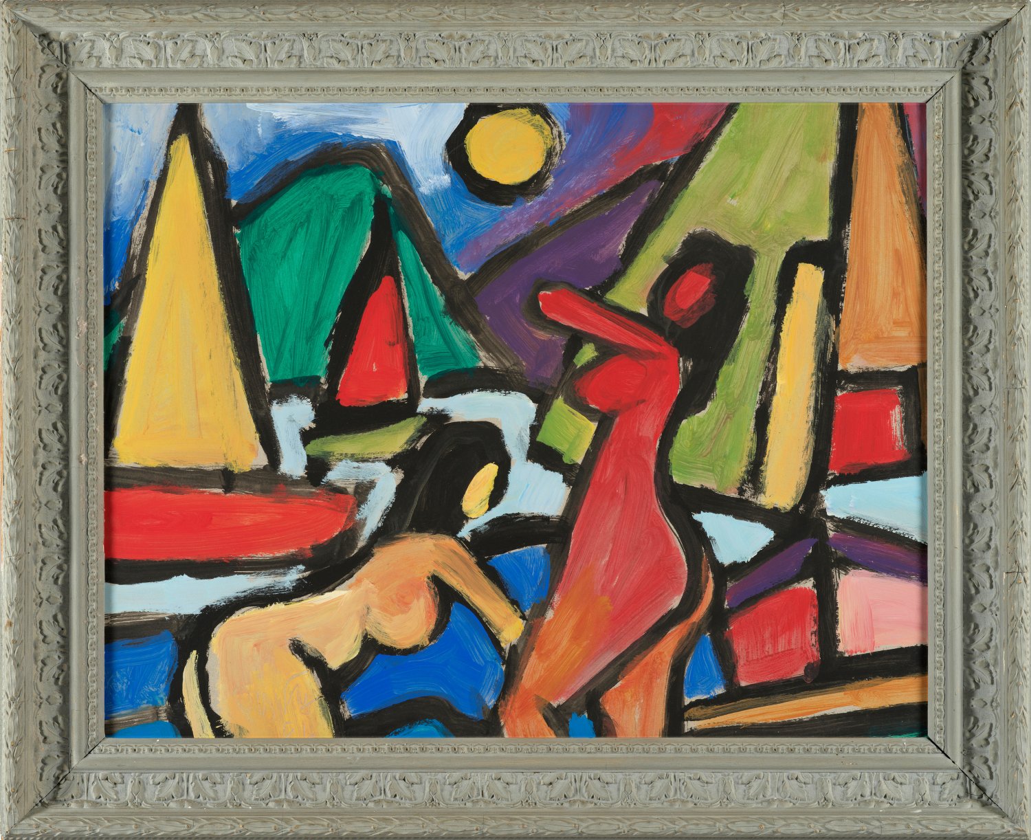 Flächig und stark konturiert angelegte Komposition in grellem, expressivem Kolorit. Repräsentatives Werk Némeths, der an der freien Kunstschule von Ödön Márffy in Budapest studierte. Bereits früh mit namhaften Künstlern wie István Szönyi, Oszkár Glatz, János Kmetty und Ményhert Tóth bekannt, entwickelte er rasch einen eigenen, charakteristischen Stil. Seine Farbwahl ist hierbei intuitiv, expressiv und leuchtend, seine Arbeitsweise impulsiv, dynamisch und oftmals in Serien angelegt, wobei der weibliche Akt ein immer wiederkehrendes Motiv bildet. Acryl/Karton. L. u. Ritzsignatur und dat. (20)06. Ca. 56 cm x 72,3 cm. Rahmen.