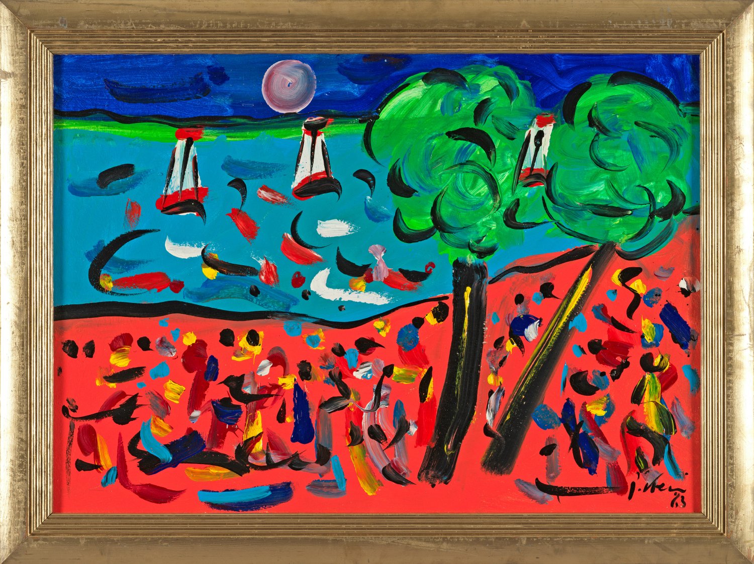 In expressivem Kolorit und dynamischem, spontanem Pinselstrich gemalte Impression des von Badegästen und Segelschiffen belebten Sees nahe Berlin. Charakteristisches Werk Keils, der bei Otto Nagel lernte und die Hochschule der Künste in Berlin besuchte. Anfang der 1980er Jahre schloss er sich den Neuen Wilden in Berlin an und fand zu einer grellen, intensiven Palette. Öl/Platte. R. u. sign. und dat. (19)83. Vero betitelt, nochmals sign. mit Ortsangabe Berlin und dat. (19)83. 50 cm x 70 cm. Rahmen.