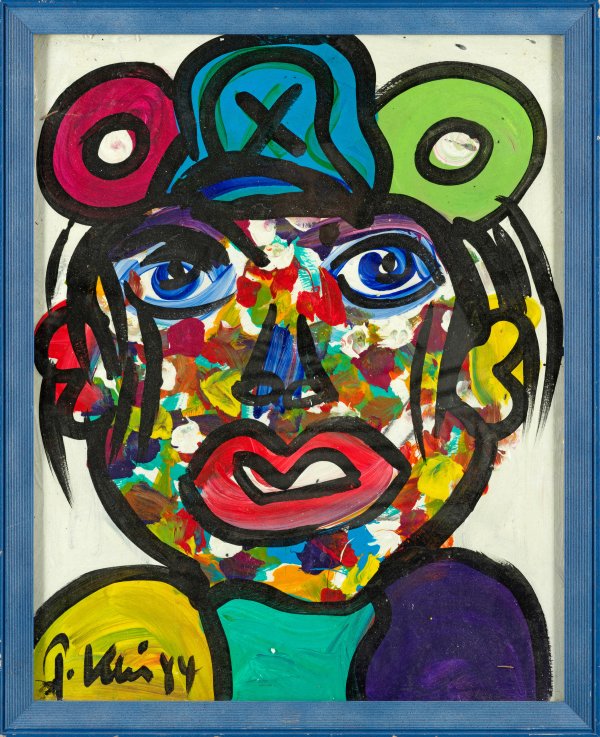 Mit breiten, kraftvoll gesetzten Konturlinien umrissene Figurenkomposition, koloriert in leuchtender Farbpalette. Charakteristisches Werk Keils aus den 1980er Jahren, in denen er sich den Neuen Wilden in Berlin anschloss. Zeitgleich entwickelte er sein typisches, grelles Kolorit und verzichtete mehr und mehr auf realistische Gegenständlichkeit. Der Berliner Künstler war Schüler bei Otto Nagel und besuchte die Hochschule der Künste in Berlin. Öl/Karton. L. u. sign. und dat. (19)84. Verso betitelt, nochmals sign. mit Ortsangabe Berlin und dat. (19)84. 50 cm x 40 cm. Rahmen.