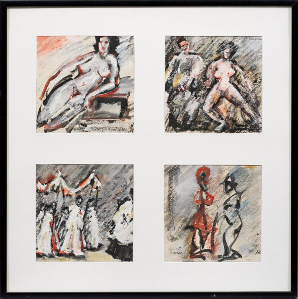 In dynamischem, expressivem Duktus und reduzierter Farbpalette geschaffene Blätter, davon drei mit Aktdarstellungen sowie eine Arbeit mit der Schilderung einer katholischen Prozession. Gouachen/Büttenpapier. Jeweils undeutl. sign.; Blattmaße ca. 20-21 cm x 20,5-21 cm. Sammelrahmen.