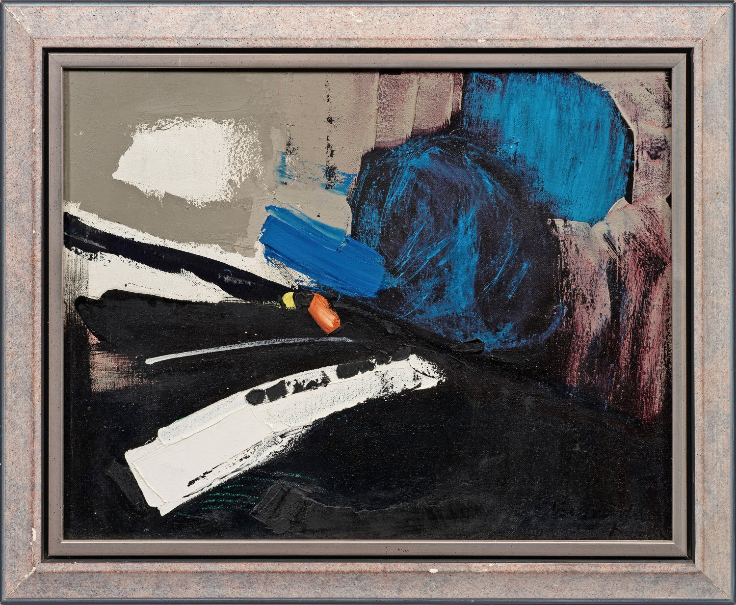 Gestisch-abstrakte Komposition, dominiert von einer schwarzen Fläche und einem blauen Gebilde, gebrochen von kontrastierendem Weiß und Grau mit kleineren Akzenten in Gelb und Rot. Vejvoda besuchte zunächst 1972-1975 die Kunstgewerbeschule in Prag, war ab 1977 als Designer für SÚRPMO tätig und vollendete sein Studium 1980-1986 an der Prager Akademie bei Prof. Frantisek Jiroudek. Öl/Lwd.; R. u. sign.; Verso Galerie-/Ausstellungsetikett u. div. Stempel. 39,5 cm x 51,5 cm. Rahmen.