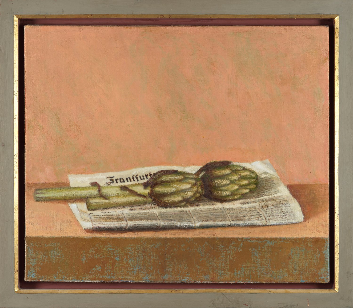 Realistisch angelegtes Stillleben mit zwei Artischocken auf einer Ausgabe der Frankfurter Allgemeinen Zeitung. Uta Reinhardt studierte Malerei an der Fachhochschule Bielefeld und der HBK Bielefeld bei Hermann Albert. Öl/Lwd.; Verso betitelt, datiert 2002/2003, mit Maß- und Ortsangabe München sowie sign.; 55 cm x 65 cm. Rahmen.