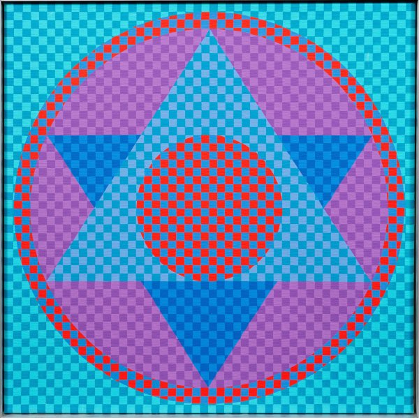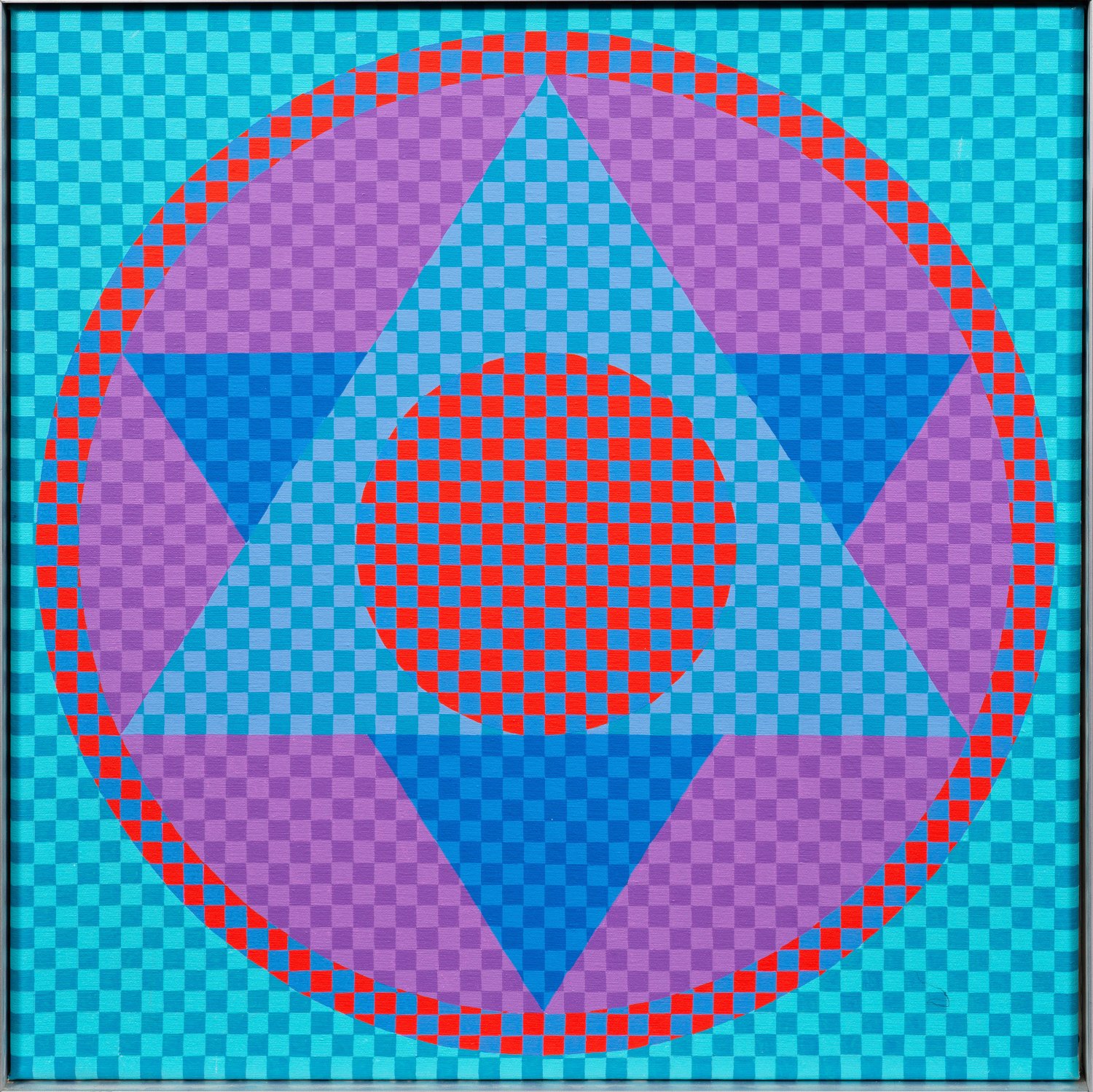 In leuchtenden Farben angelegte Op-Art-Komposition der Künstlerin Sine Hansen, die 1961-1966 an der Hochschule für Bildende Künste in Braunschweig bei Peter Voigt, Johann Georg Geyger und als Meisterschülerin bei Roland Dörfler studierte. In den 1960er Jahren hielt sie sich zu Studienzwecken auf Schloss Wolfsburg sowie in Amsterdam und Paris auf. Öl/Lwd.; Verso zweifach betitelt, dat. 1999 u. sign. sowie mit rotem Inkastempel. Ca. 50 cm x 50 cm. Rahmen.