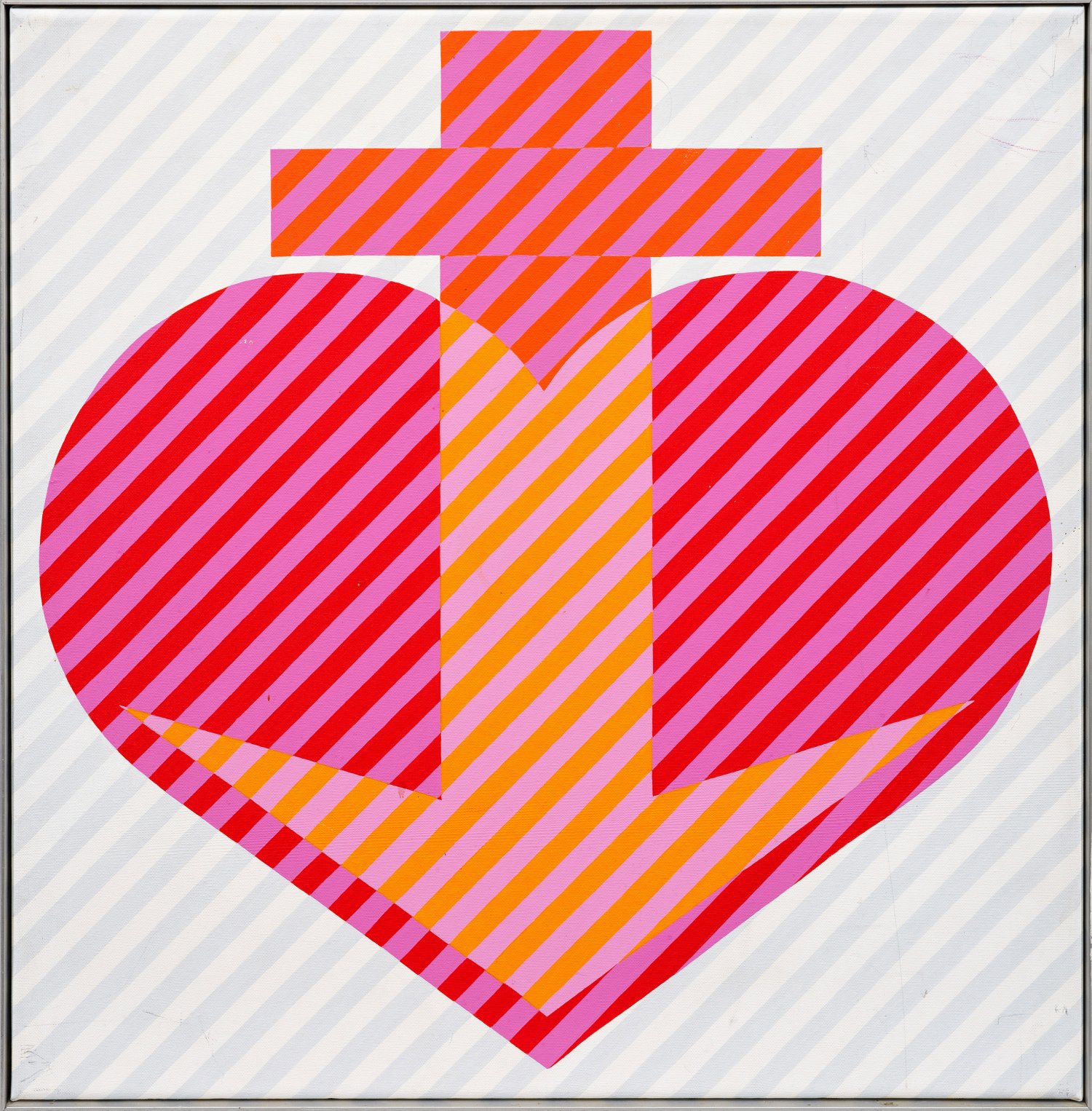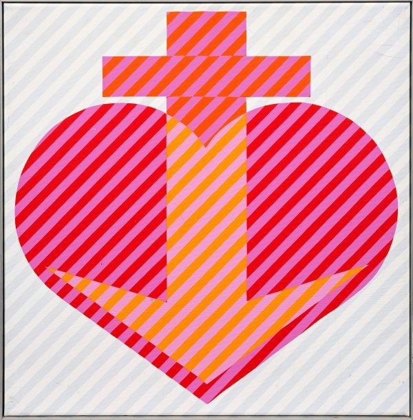 In Rot- und Grautönen gemalte Op-Art-Komposition mit den christlichen Symbolen Kreuz, Anker und Herz für Glaube, Liebe und Hoffnung. Sine Hansen besuchte 1961-1966 die Hochschule für Bildende Künste in Braunschweig bei Peter Voigt, Johann Georg Geyger und als Meisterschülerin von Roland Dörfler. Nach Studienaufenthalten auf Schloss Wolfsburg, in Amsterdam und Paris, lebte Sie zusammen mit ihrem Ehemann, dem Maler Jobst Meyer, in Braunschweig. Öl/Lwd.; Verso zweifach betitelt, dat. 1994 u. sign. sowie mit Widmung. Ca. 51 cm x 51 cm. Rahmen.