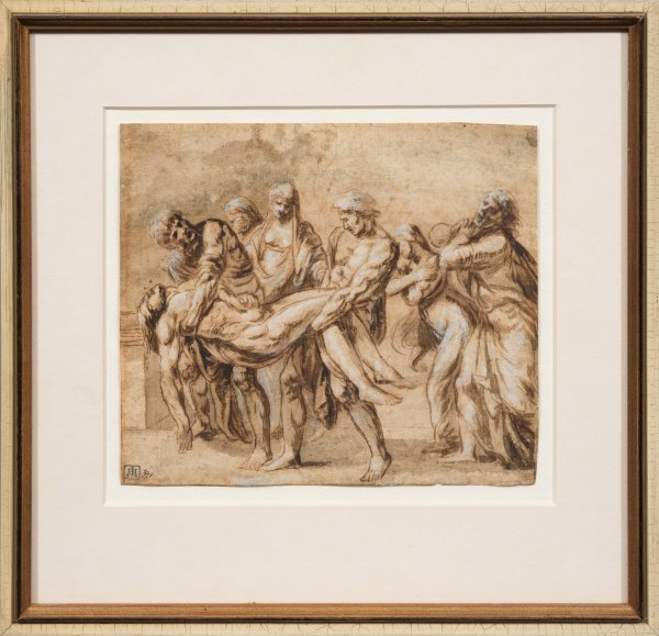 Szenische, vielfigurige Darstellung mit dem von zwei Männern getragenen Christus, Maria und drei weiteren Trauernden. Das Blatt ragt außer durch die effektvolle, dramatische Schilderung des Geschehens durch das außergewöhnliche Interesse des Künstlers an der plastisch wiedergegebenen Anatomie Christi und der ihn tragenden, muskulösen Begleitfiguren heraus. Feder u. lavierte Tusche mit Weißhöhungen/Bütten. L. u. Sammlerstempel von François Alziari Baron de Malaussena (Lugt 1887) u. handschriftliche (durchgestrichene) Nr. 371; verso zwei alte Namen- bzw. Sammlernamen, einer undeutl. der andere "La Fayette" (möglicherweise für Marie-Madeleine La Fayette, 1634 Paris - 1693 ebenda). 17,5 cm x 20,2 cm. Rahmen.