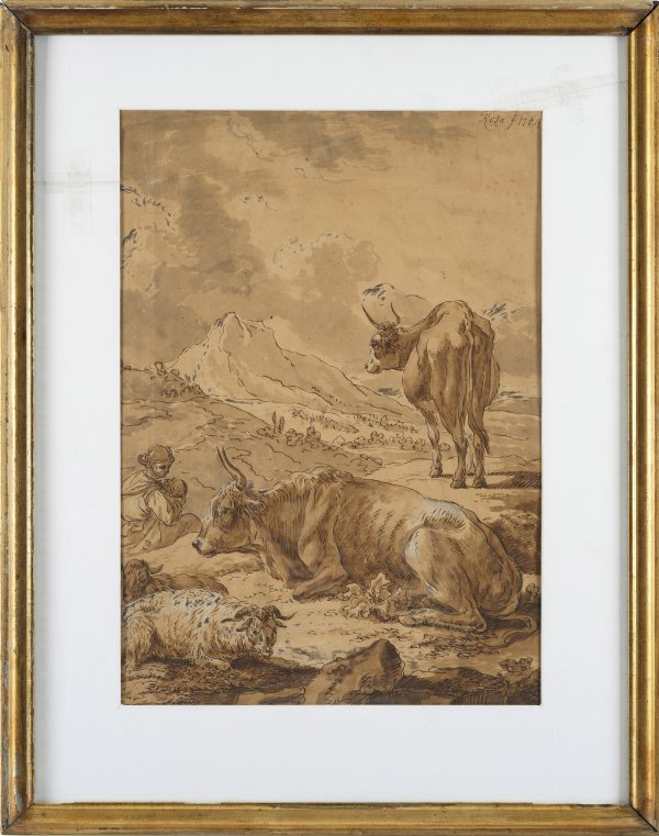 Auf einer Wiese vor Gebirgskulisse eine rastende junge Hirtin, liebevoll ihren Säugling in den Armen wiegend, mit Rindern und Schafen. Typische Landschaftsidylle mit pastoralem Motiv des österreichischen Malers, welcher der bedeutenden, teilw. in Italien ansässigen Malerfamilie Roos entstammte. Joseph Roos wurde an der Wiener Akademie ausgebildet und war später als Leiter der kaiserlichen Gemäldegalerie tätig. Berühmt wurde er als Schöpfer der 1762-1765 entstandenen Landschafts-Wandmalereien in den drei sog. "Rosazimmern" des Schlosses Schönbrunn in Wien. Lavierte Federzeichnung in Sepia mit Weißhöhung/Papier. R. ob. sign. und dat. 1764. Verso Sammlerstempel (Lugt 1994) in Blau sowie in Bleistift bez. "No.1". 48,2 cm x 33,9 cm. Rahmen.