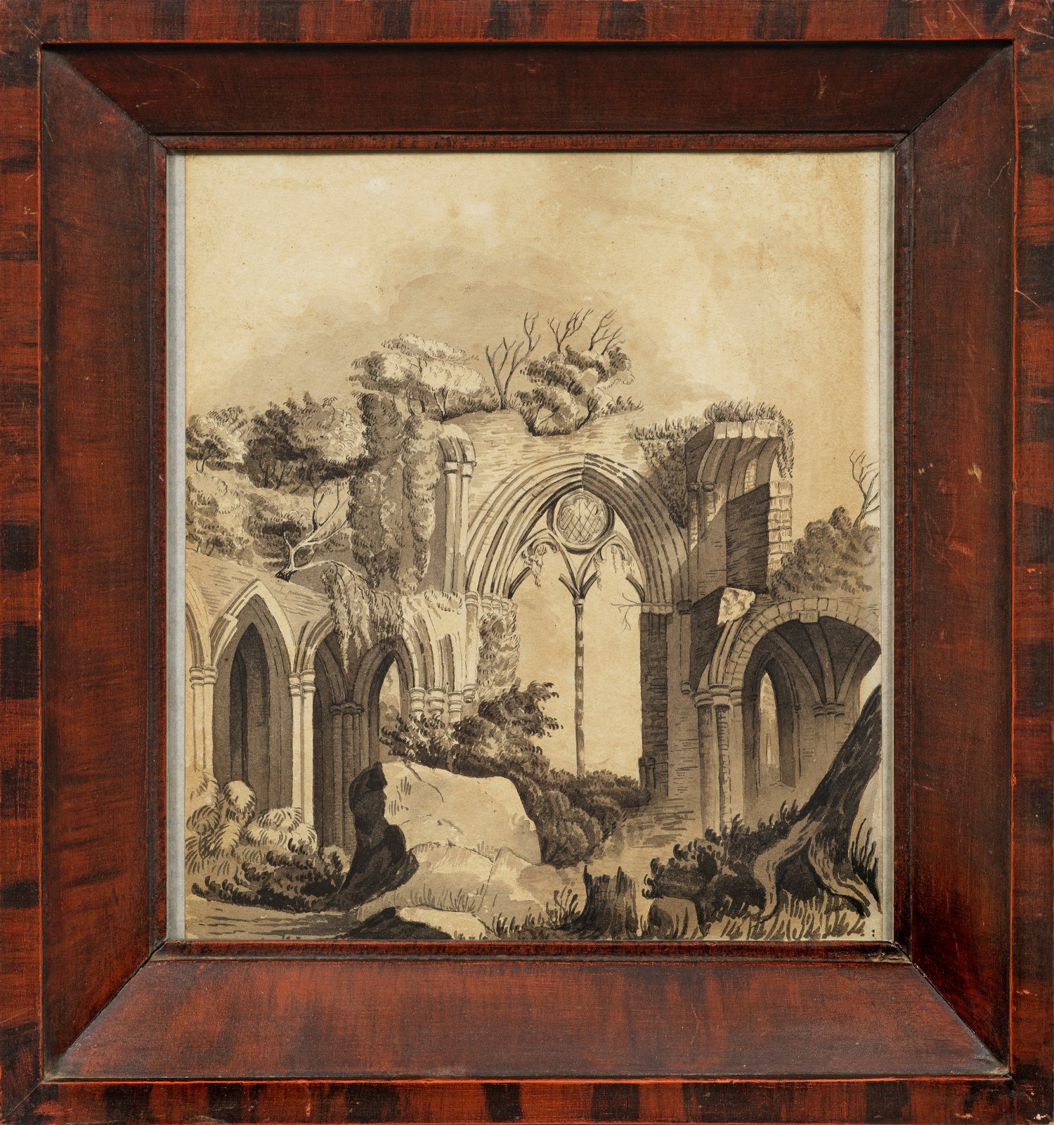 Die berühmte Ruine der Zisterzisienserabtei Netley Abbey bei Southampton in Hampshire wurde seit Ende des 18. Jhs. von vielen englischen Malern, Zeichnern und Grafikern dargestellt: u. a. Michael Angelo Rooker, William Turner und John Constable. Feder u. lavierte Tusche/Papier. Ca. 26 cm x 22,5 cm. Rahmen.